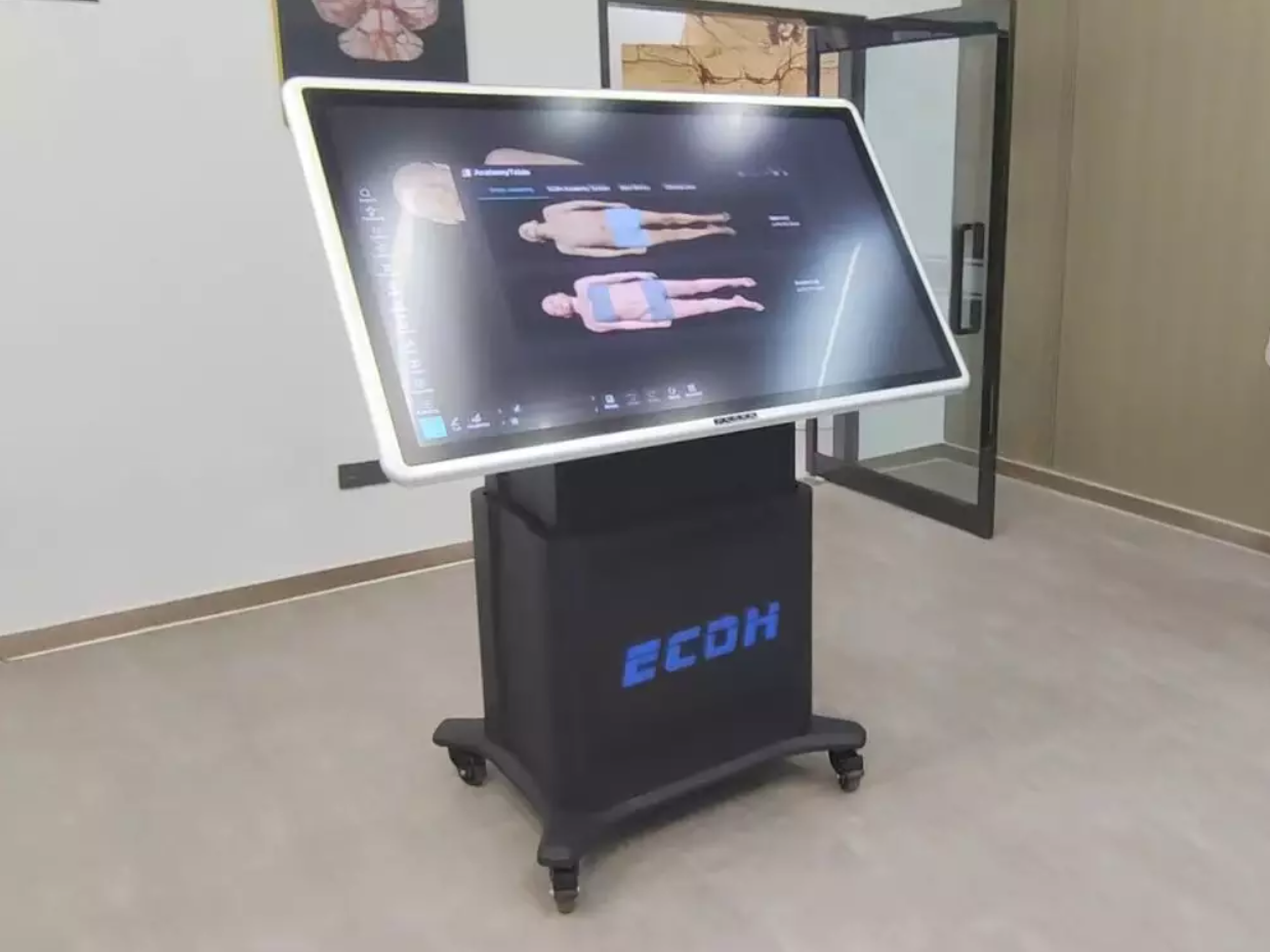 The ECDH Anatomy System integrated with the table includes extensive educational resources. It offers over 3,000 3D structures, more than 3,000 sectional images, 1,700 CT and MRI images, 100 teaching videos, and 1,800 exercises. Teachers can operate the professional software via the touchpad, while students can explore human anatomy using 3D glasses in an open, interactive environment. This combination of immersive technology and educational content enhances understanding of complex anatomy topics, making the learning process engaging and scientifically accurate.
